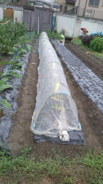 今日は朝から雨模様。 白菜を植えました。虫がつかないように、寒冷しゃを被せました。